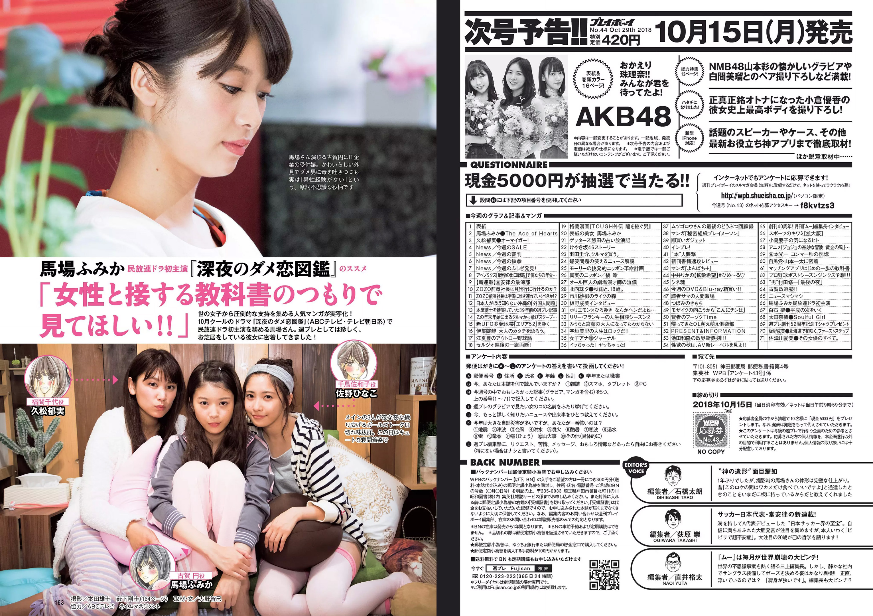 [Weekly Playboy] 2018 No.43 (馬場ふみか 久松郁実 北向珠夕 白石聖 太田奈緒 板野成美 佐津川愛美 他)